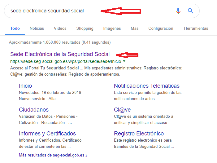 1.- Buscamos en Google o en cualquier otro buscador ‘Sede electrónica seguridad social‘, lo mismo da si ponemos ‘sede electrónica inss’ o algo similar. Seleccionamos el primer resultado
