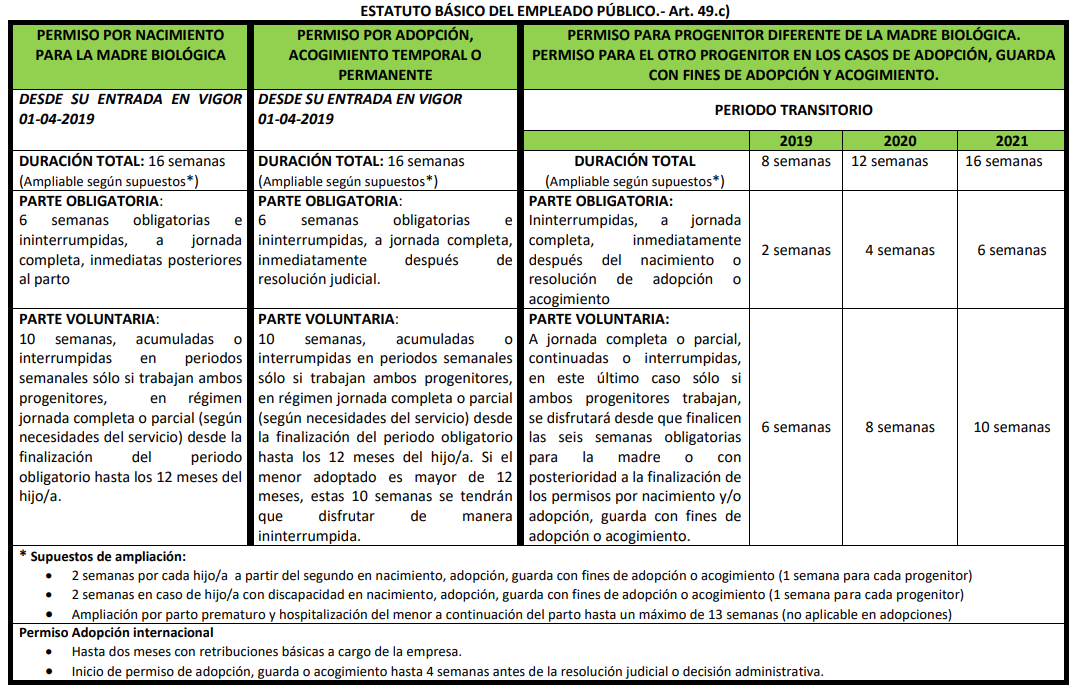 A partir de 1 de enero de 2020 tiene una duración de 12 semanas, de las cuales las cuatro primeras debe disfrutarlas de manera ininterrumpida a continuación del parto.