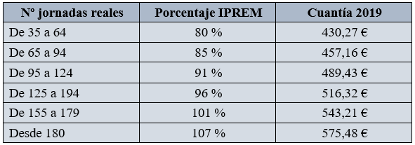 El cálculo se hace en relación al número de jornadas reales que se puedan acreditar, y se calcula en función de un porcentaje del IPREM de la siguiente manera:
